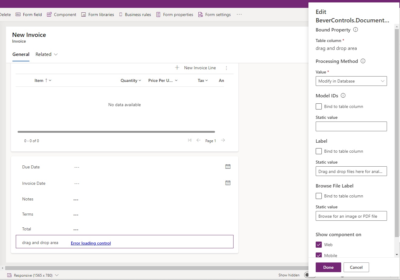 Administrators should then include a drag-and-drop control within the entity form. To do this, the "BeverControls.DocumentOCR.DragAndDropArea" control should be applied to any "Single Line of Text" field.